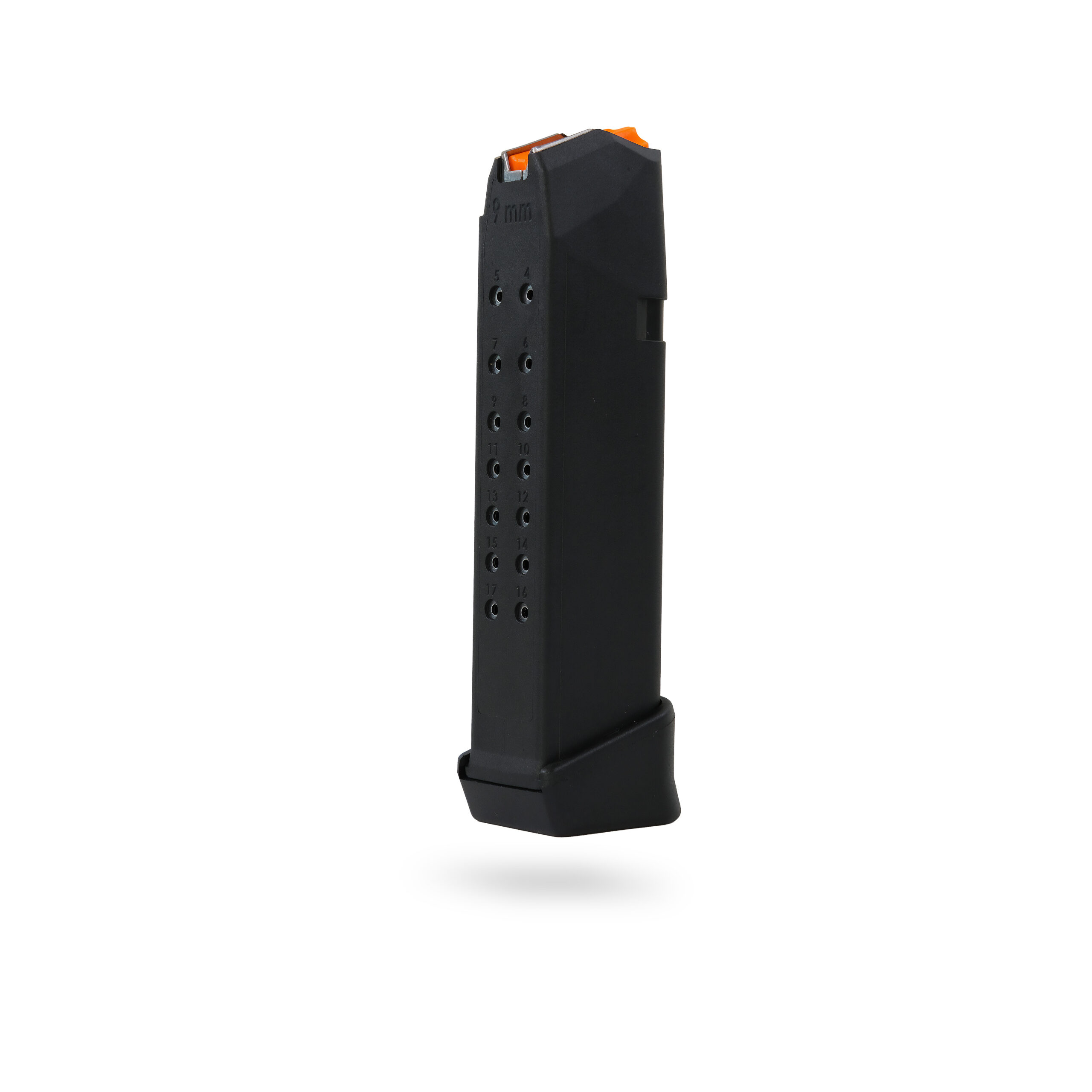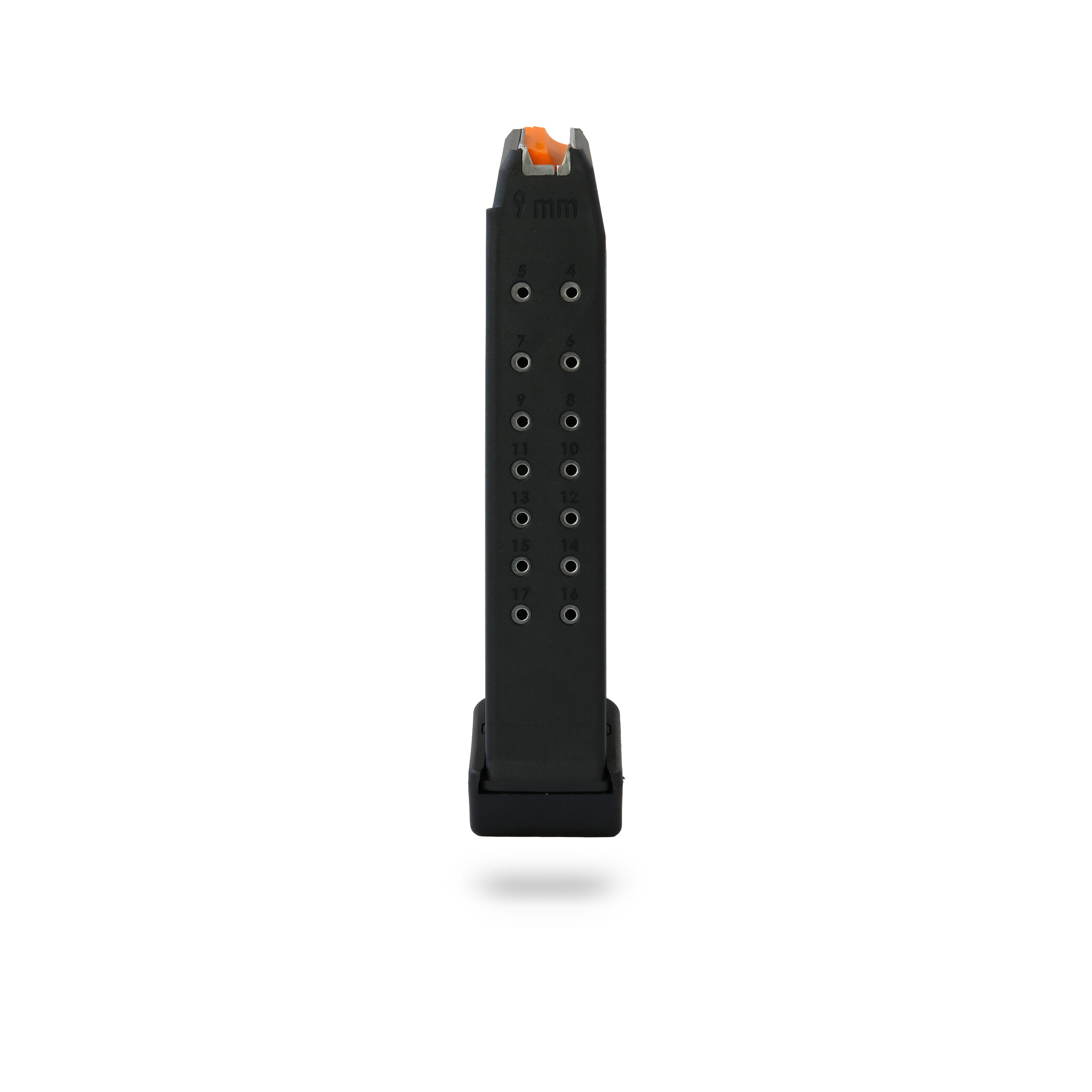 The integrated +2 extension boosts total capacity to 19 rounds, while the high-visibility orange follower allows for quick chamber status checks. Rear-positioned witness holes make it easy to verify your remaining rounds at a glance, and a high-tensile steel spring ensures flawless feeding under all conditions.