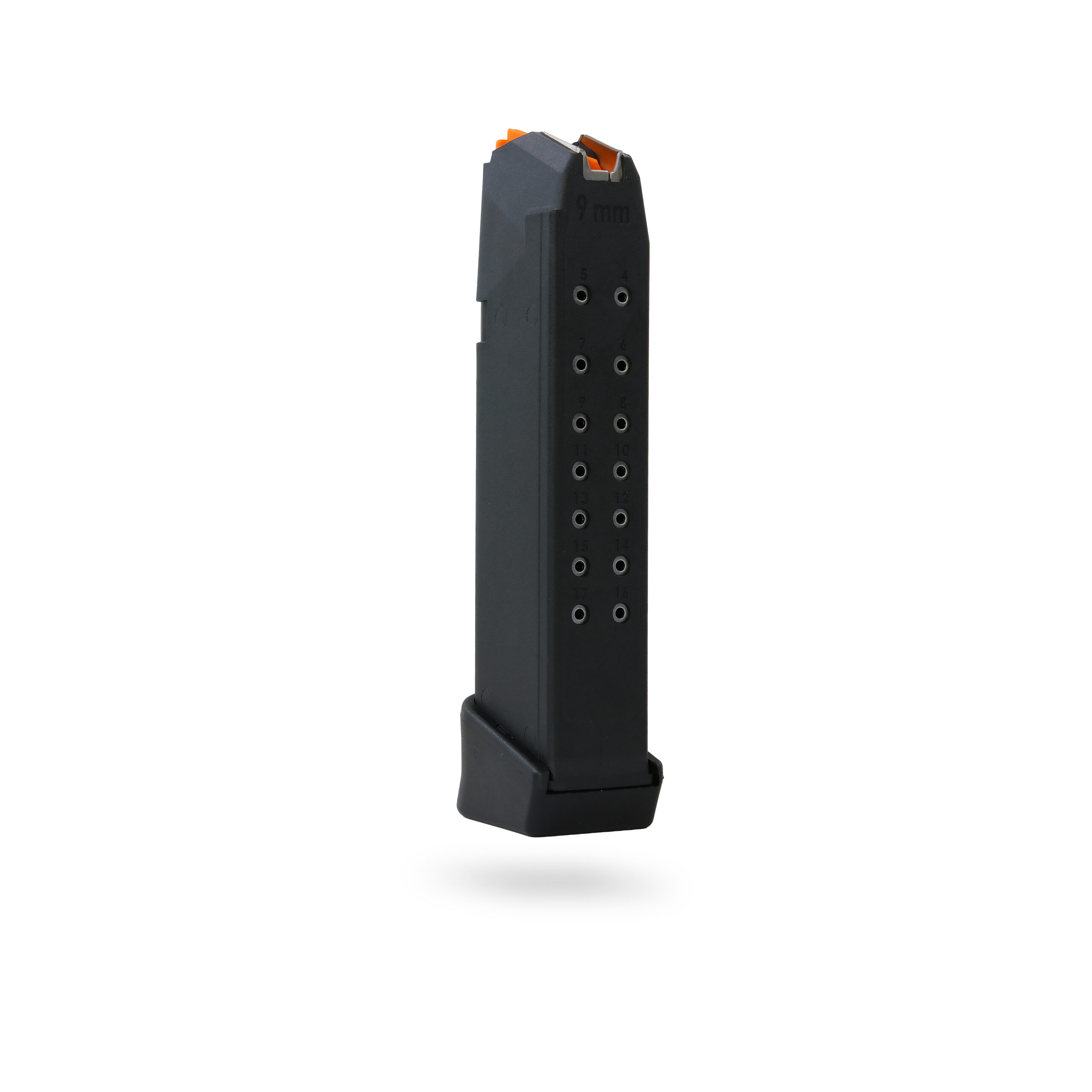 The 17 Round 9×19 Glock Magazine +2 Extension Black – Orange Follower combines OEM-level reliability with increased capacity. Built from durable polymer with steel-reinforced feed lips and a high-visibility orange follower, this magazine ensures smooth feeding and consistent performance in any environment.
