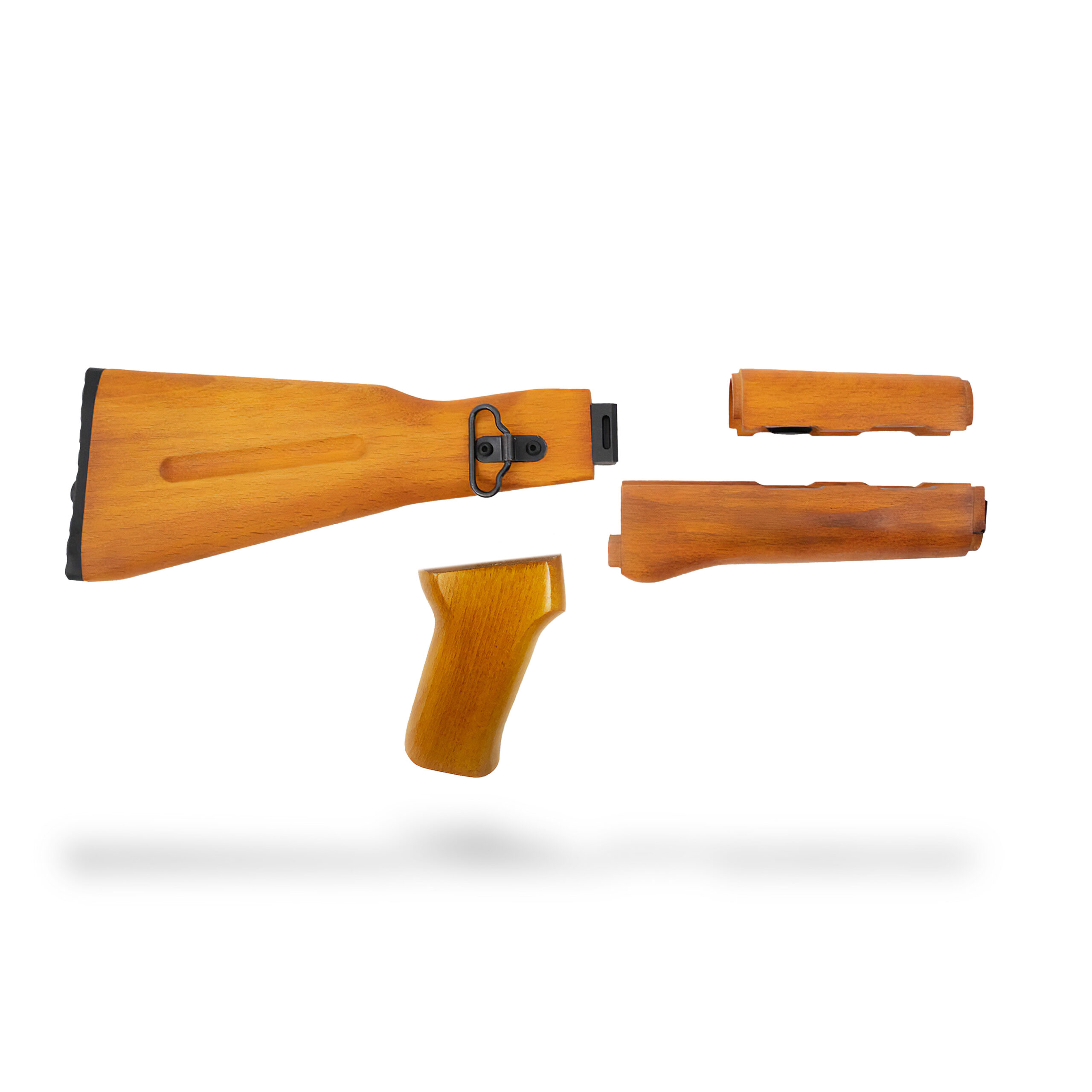 Finished in sleek Honey Blonde, the Traditional Side-Folding Wood Stock Set delivers classic wood furniture for AKM-pattern rifles with 5.5mm side-folding trunnions. Includes folding stock, grip, and matching upper and lower handguards – built for fit, made to perform.